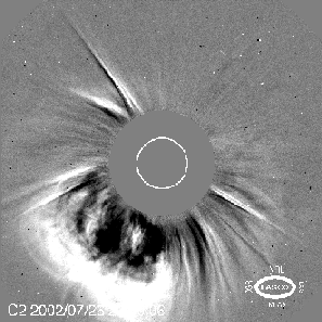 In the image on the left, taken by LASCO on July 26, a large mass ejection
